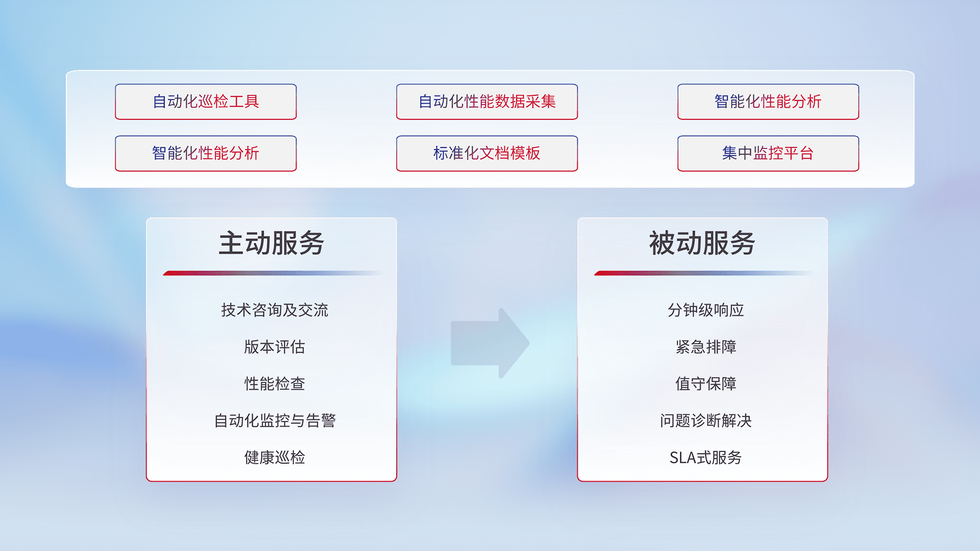 智能化工具和标准化文档,,,,保障服务质量,,,提供主动服务(包含技术咨询、、、版本评估、、性能检查、、、、自动化监控与告警、、、健康巡检)和被动服务包含(分钟级响应、、、、紧急排障、、、、值守保障、、问题诊断解决、、、SLA服务)。。