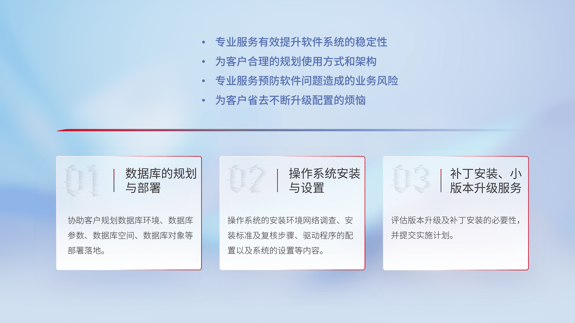 为客户提供软件规模升级、、快速部署、、、按需配置的专业服务,,从数据库的规划与部署到操作系统的安装与设置,,,,再到补丁安装和小版本升级提供支持。。。。